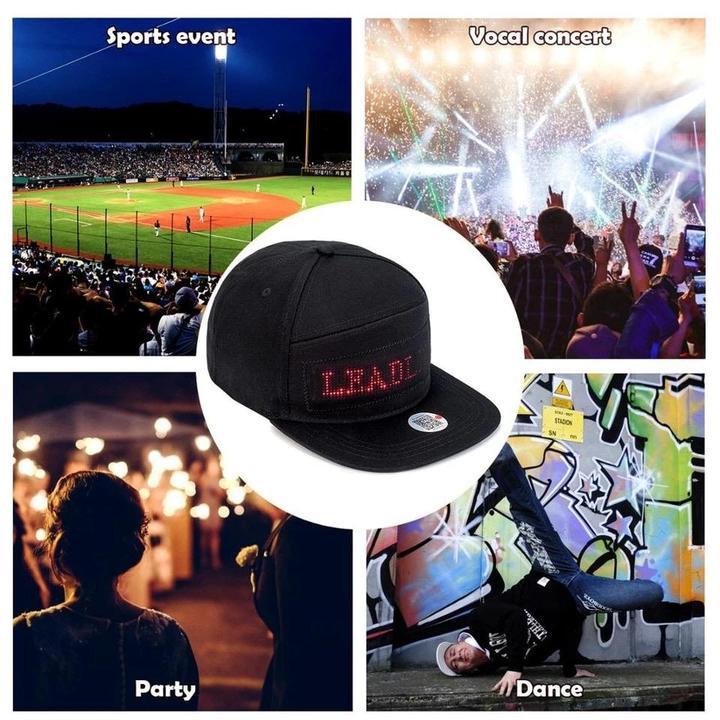 The LED panel of this amazing "SMART LED CAP" shows any words as desired... So put on this cap, you will immediately attract everyone’s attention!